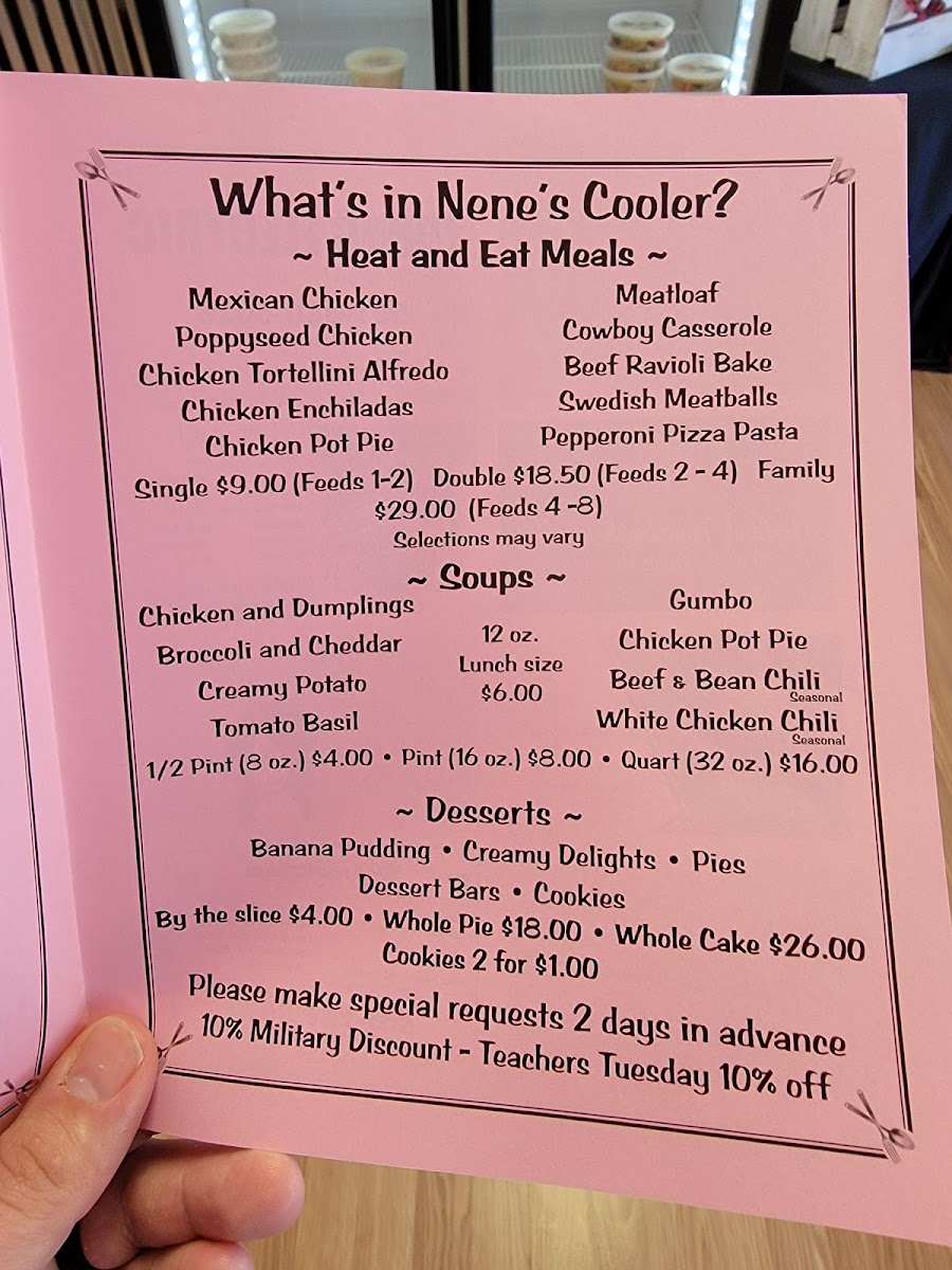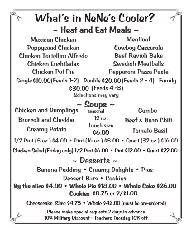 NeNe offers a Full Lunch Menu , Daily Lunch Specials, Heat and Eat Meals, and Sweet Treats